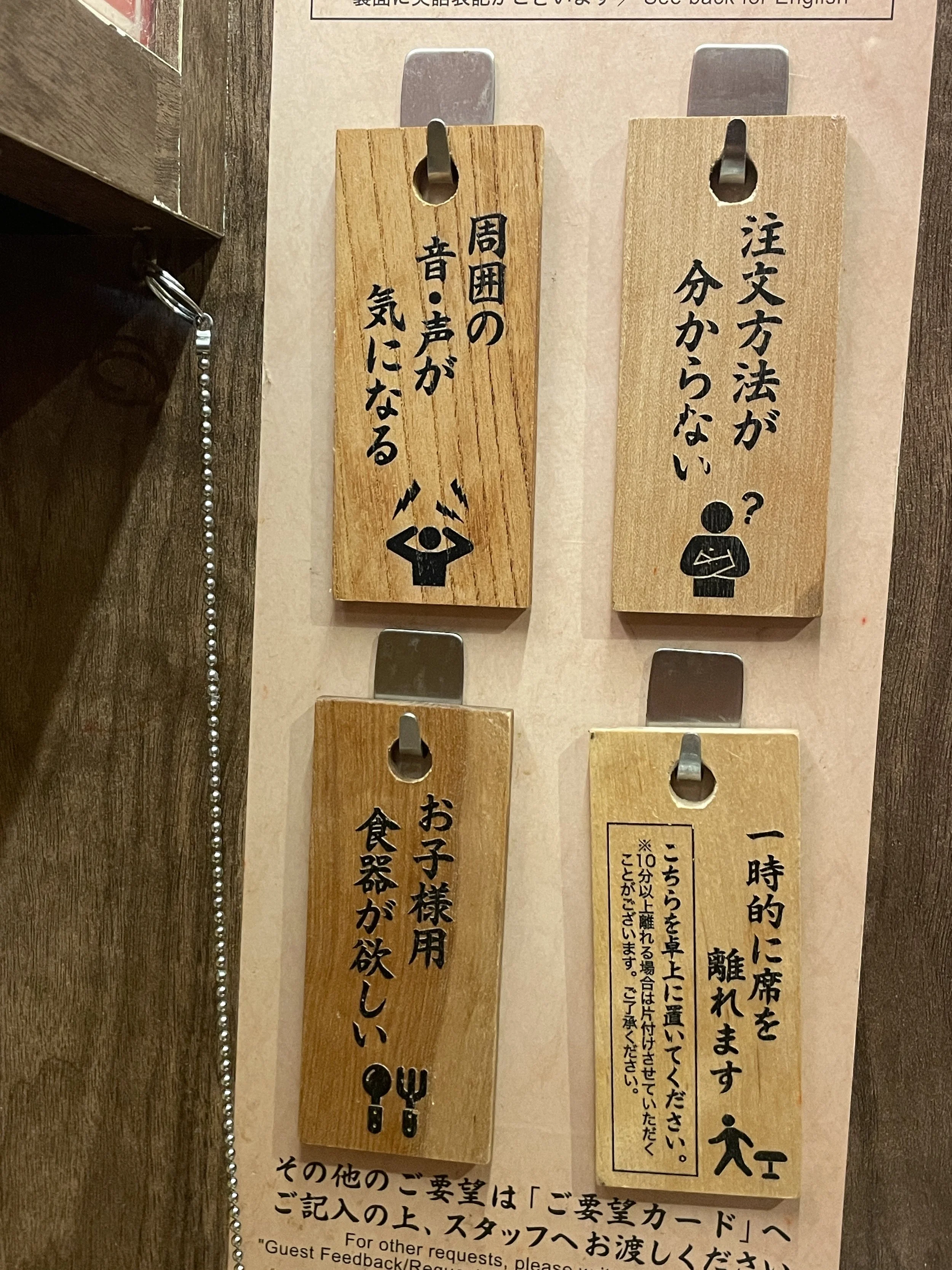 You can’t see the staff. You’re not meant to interact with the staff, actually, at least not by verbal means. On the wall are little wooden blocks, each with a message in Japanese & English both, proclaiming things like: