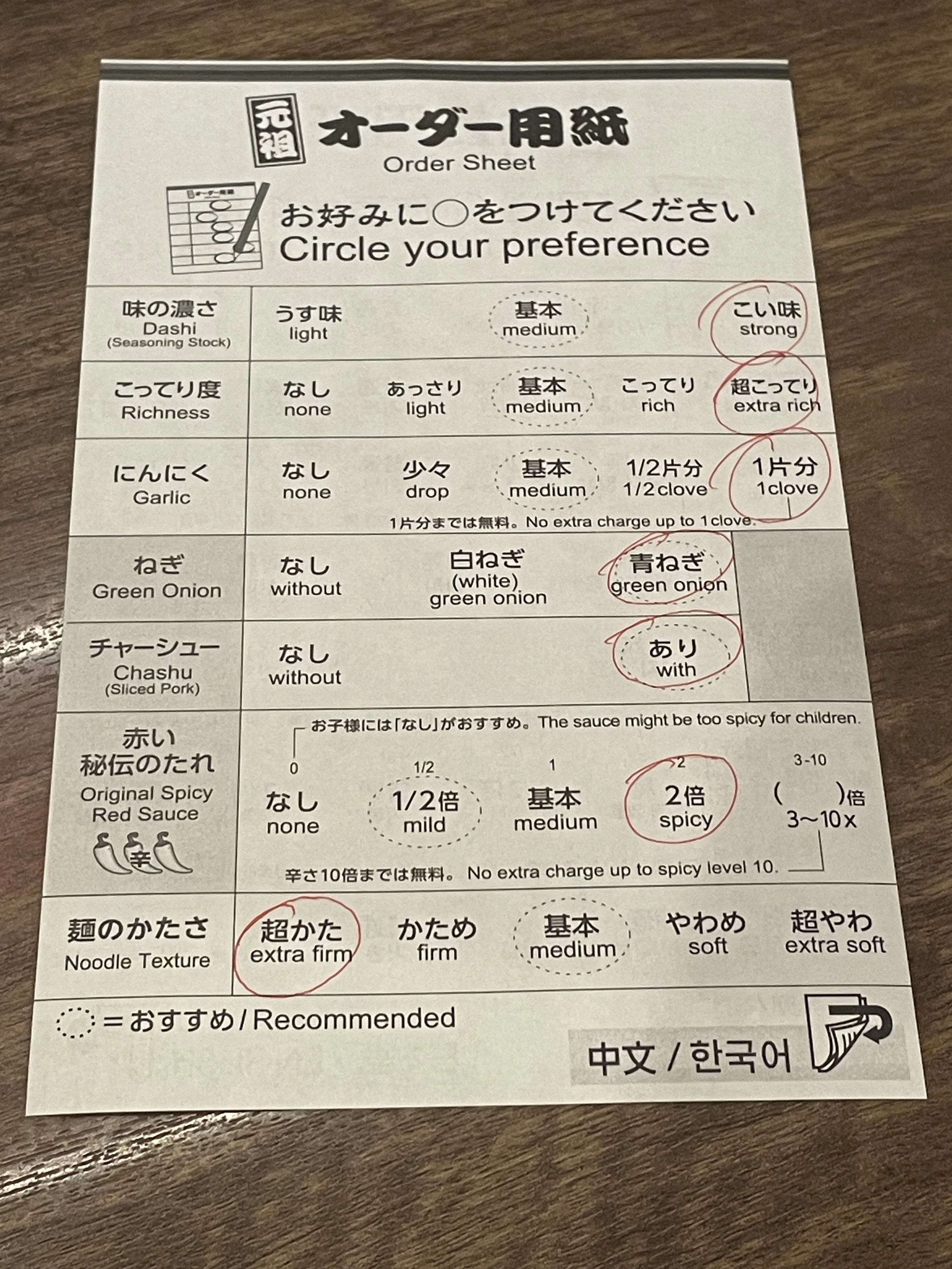 Instead, they hand you homework. Choose your soup intensity, oil level, garlic & onion amount (but it costs extra to get a reasonable amount), noodle firmness and spice level.
